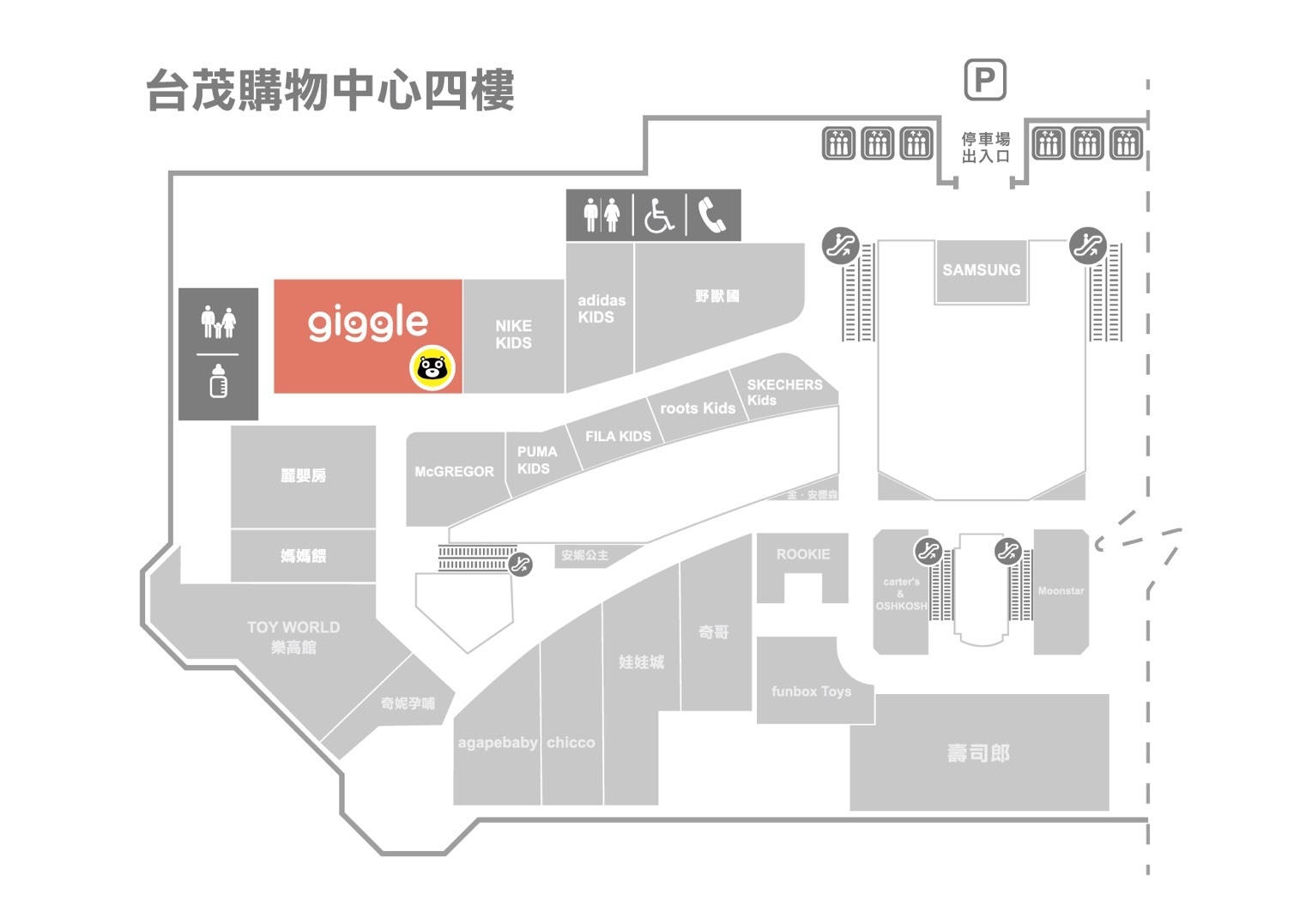桃園台茂店位於台茂購物中心四樓giggle櫃位內,可直接將車停放在購物中心停車場,消費可折抵賣場停車費。