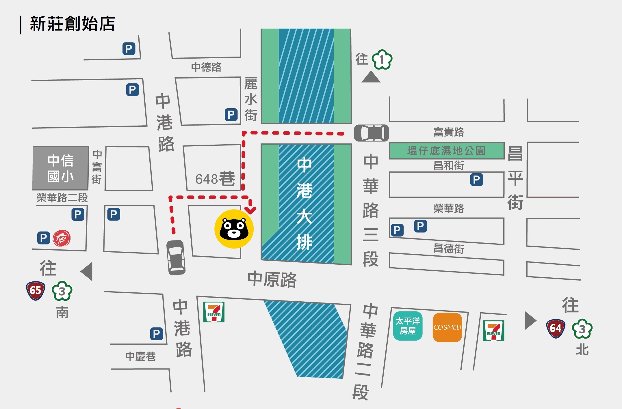 ◎副都心站(機場線):2號出口轉乘617、813區、835,在「中原路一」或「中原里」站下車。