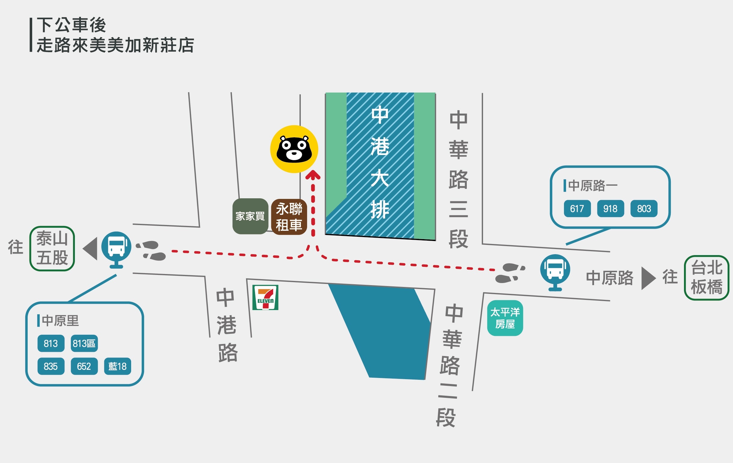 可先在google map搜尋「美美加」後搭配APP建議的乘車方式。